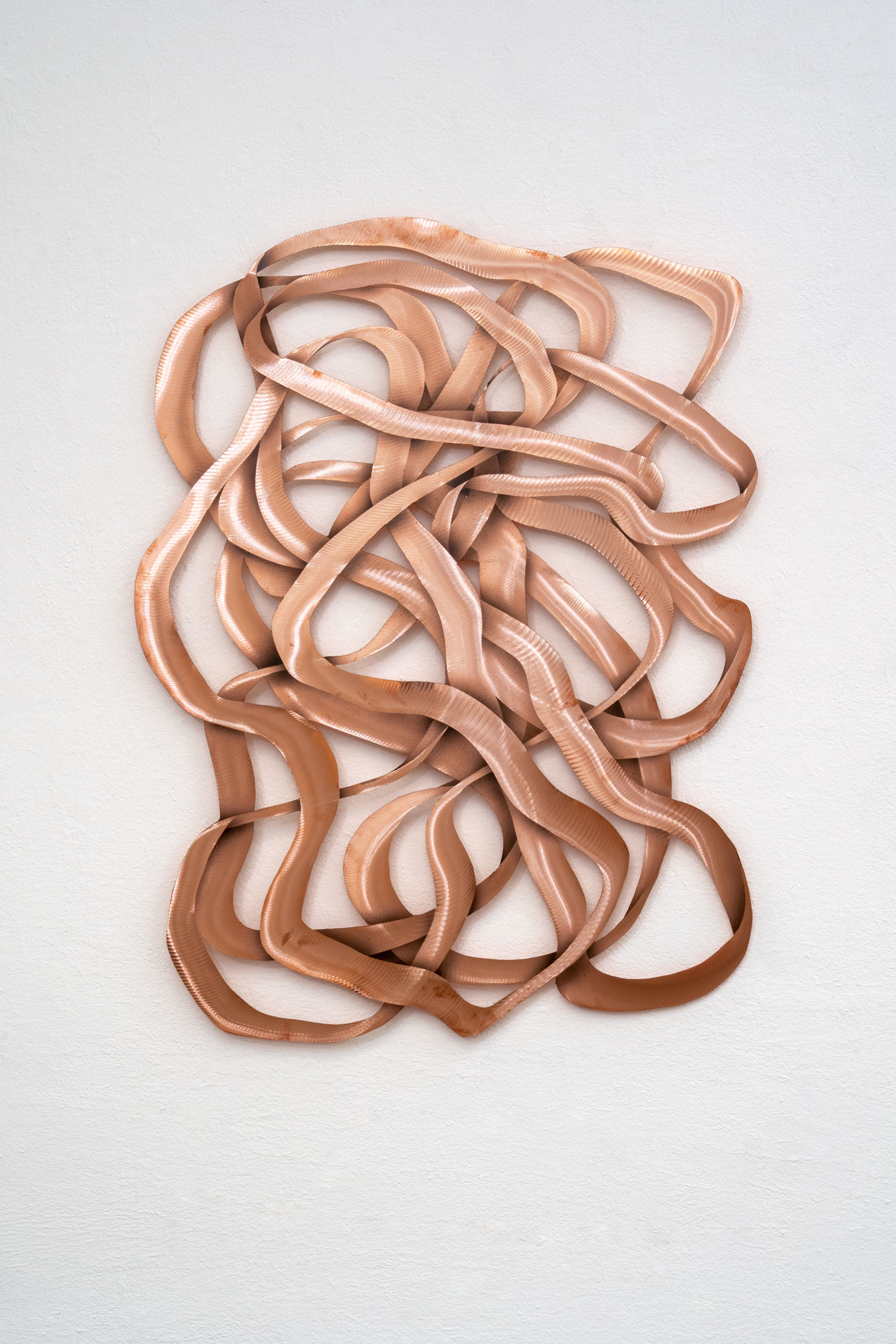 Sebastian Gumpinger’s practice revolves around the line - not as a static boundary, but as a dynamic agent that occupies space, reflects light, and interacts with perception. Using angle grinders, he carves gestural, rhythmic marks into highly polished steel and copper surfaces. Despite their physical thinness - often just 2 mm - the plates appear sculptural, almost voluminous. Light becomes an active component of the work: as the viewer moves, the surface shifts, creating a visual experience that is constantly in flux. The works appear not as static images, but as living surfaces that respond to time, space, and presence.